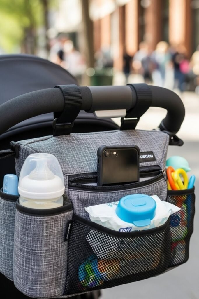 A stroller organizer keeps essentials like bottles, wipes, snacks, and phones within easy reach during walks or errands.