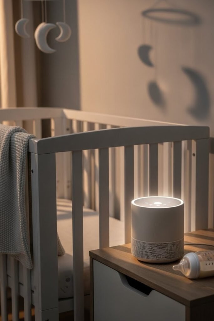 A sound machine helps babies sleep by creating calming background noise like white noise or soft lullabies. It can make nighttime routines smoother for both parents and baby.