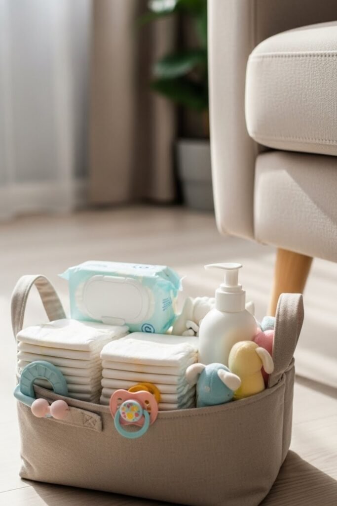 A diaper caddy keeps all baby essentials in one easy-to-reach place. Parents can store diapers, wipes, creams, and small toys without running back to the nursery.