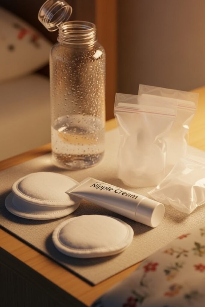 A nursing essentials kit supports new moms during feeding routines. It may include nipple cream, breast pads, storage bags, and soothing items.