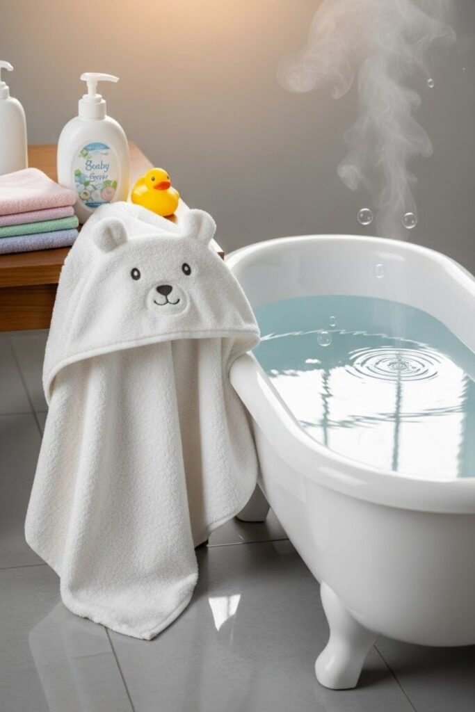 A baby bath set makes bath time safer and more enjoyable. Common items include gentle soap, shampoo, washcloths, and a soft hooded towel.
