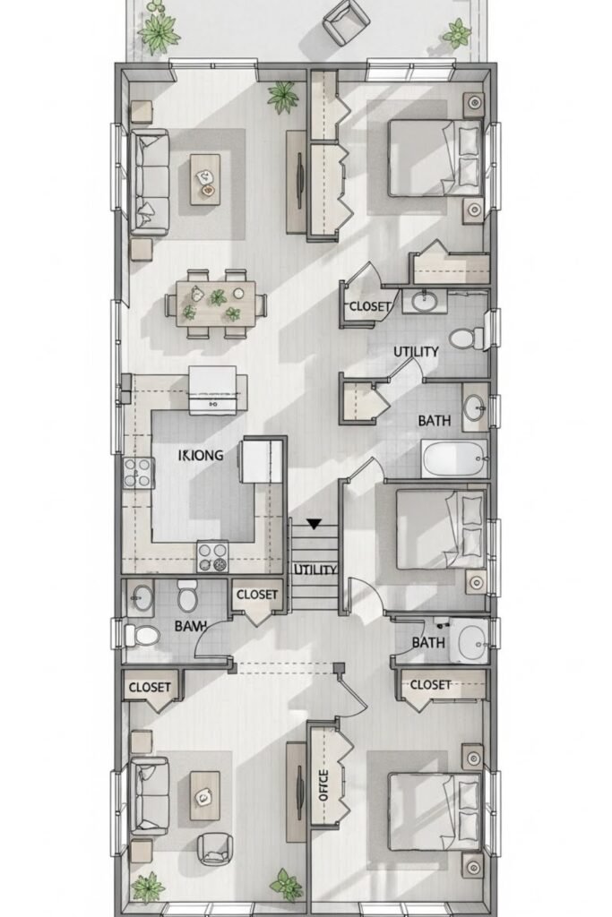 A narrow plan is designed for long, slim lots. Rooms are arranged in a straight line or compact clusters to avoid wasted space.