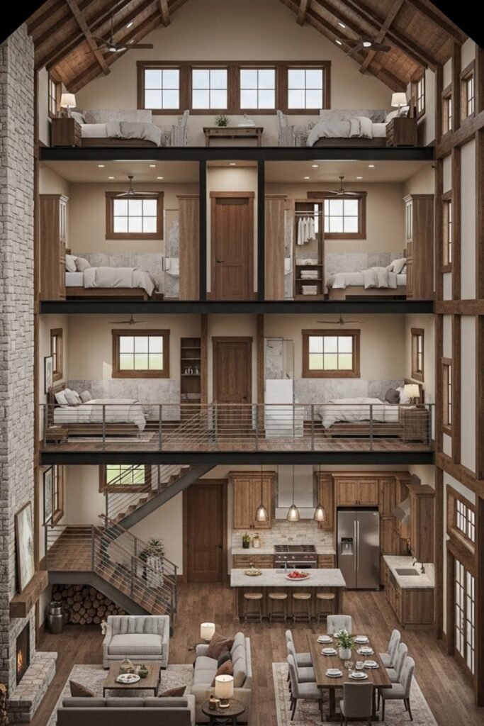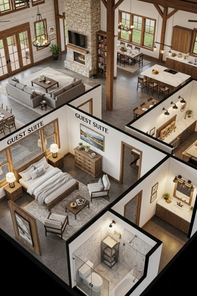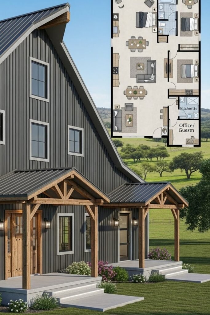 This layout keeps the traditional barn shape while modernizing the interior flow. Open living spaces sit at the center, with private rooms placed along the edges.