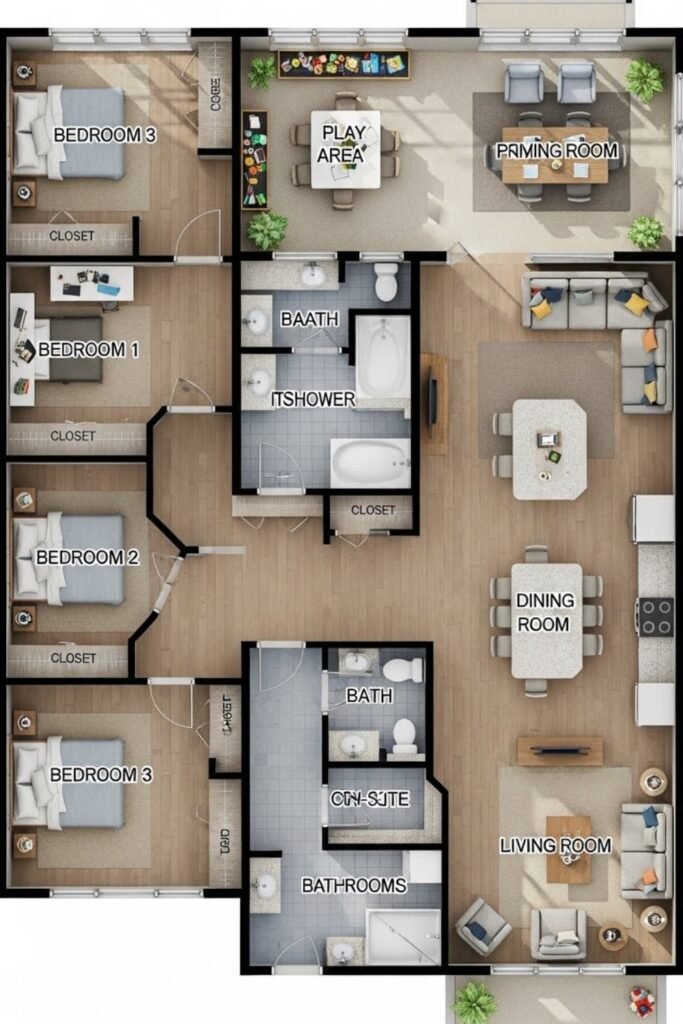 This plan groups children’s bedrooms and a shared bathroom into one section of the home. A small play or study area may sit nearby.