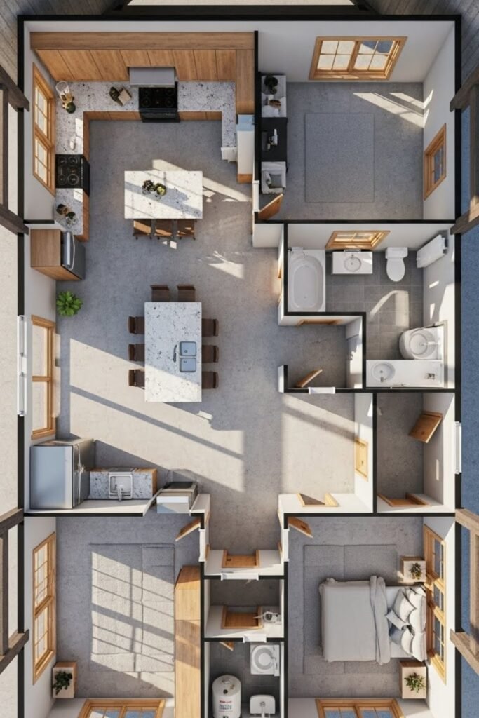 This layout centers around a large open living space that connects the kitchen, dining, and living room. Walls are minimized to allow easy movement and social interaction.