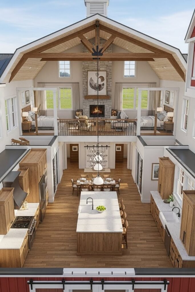 The design balances rustic structure with comfortable everyday living, making it a great choice for homeowners who want classic barn character inside.