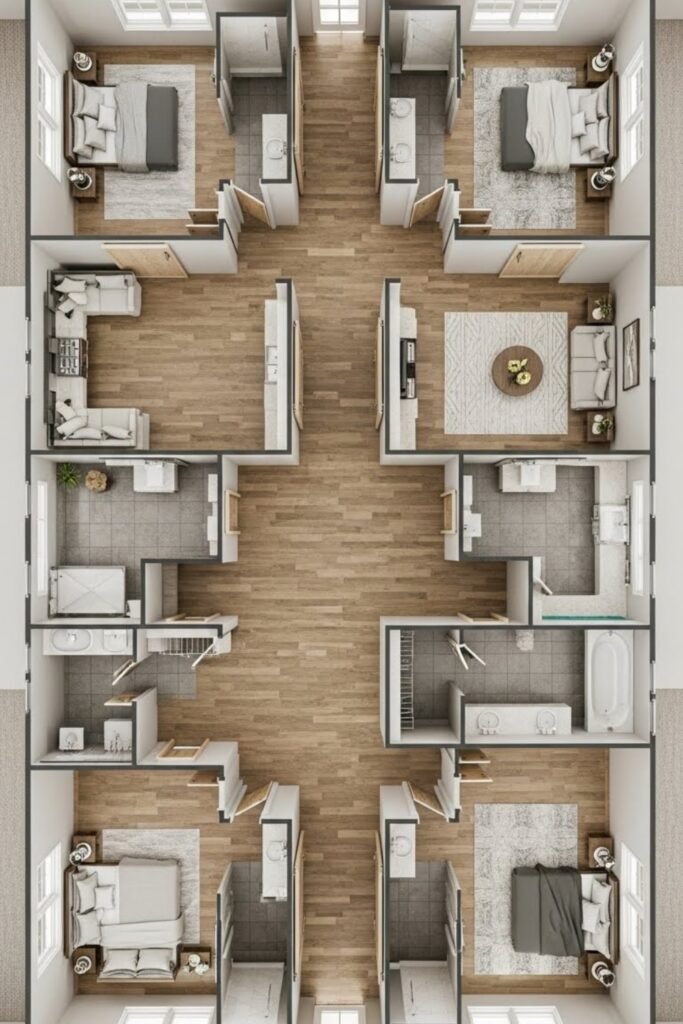 It creates clear circulation and strong separation between spaces. This layout works well for rectangular buildings and keeps the home organized and easy to navigate.