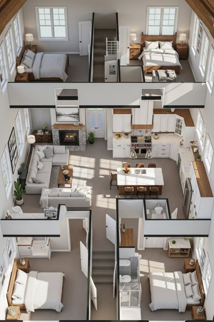 Shared spaces like the kitchen and living room stay in the center. This design reduces noise, improves privacy, and works well for families, guests, or multi-generational households.