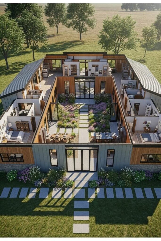 This barndominium floor plan is built around a central open courtyard. Main living areas and bedrooms face inward, allowing natural light and airflow throughout the home.