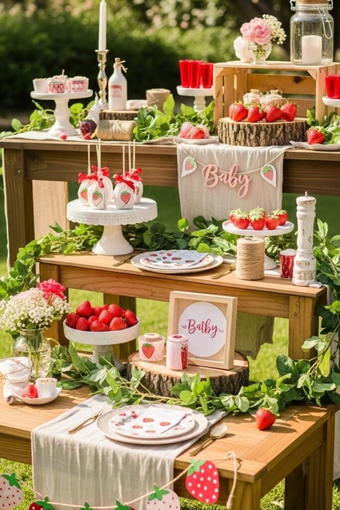 Create a strawberry patch feel using soft reds, leafy greens, and natural textures. Decorate tables with strawberry prints, faux vines, and simple wooden accents.