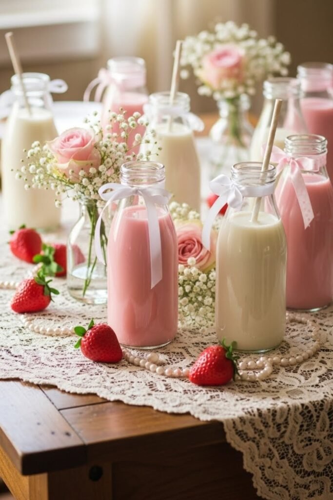 Inspire the theme with strawberry milk tones—soft pinks, whites, and creamy textures. Use vintage-style bottles, glass jars, and simple table settings.