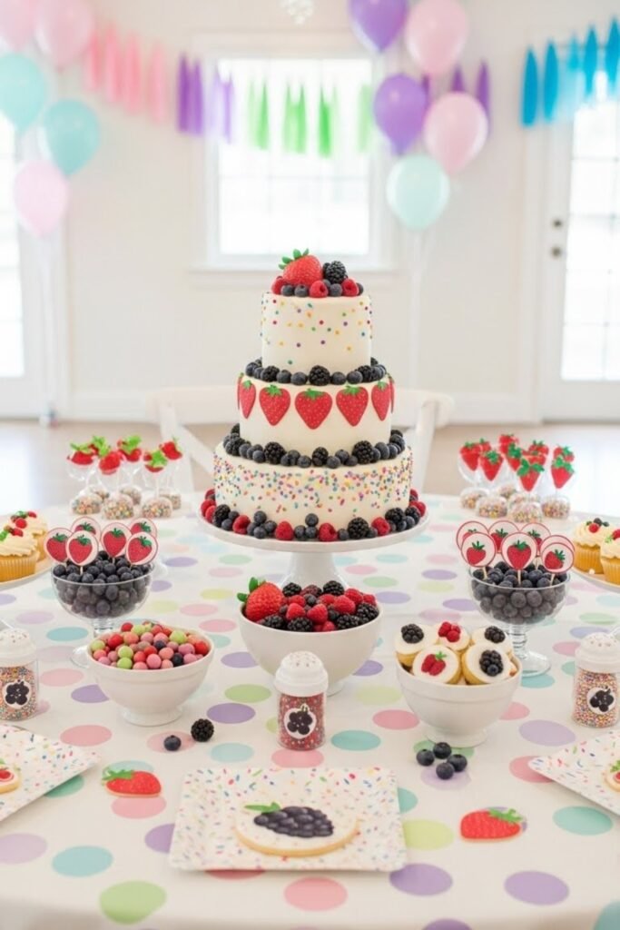Add a playful twist using sprinkle patterns paired with berry colors. Think dotted table linens, confetti details, and light candy-style accents.