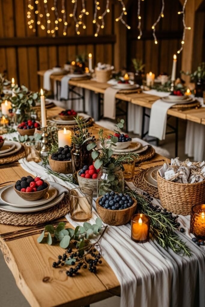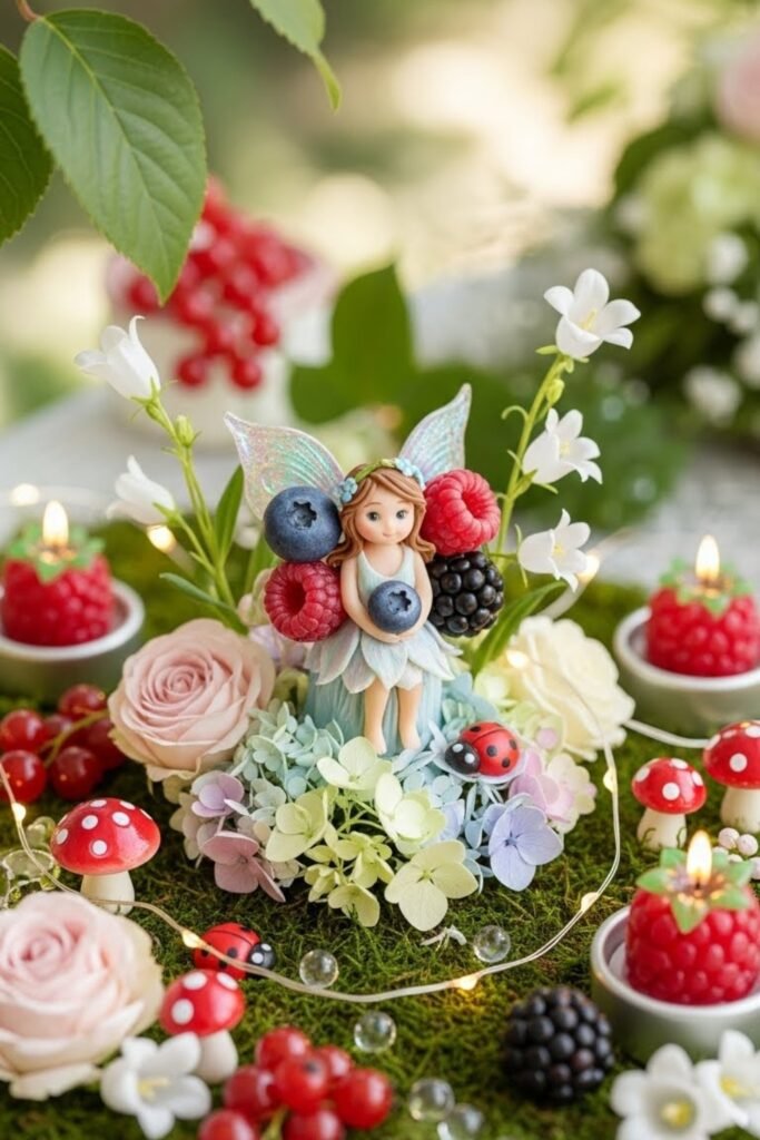 Add a whimsical touch by blending berries with a fairy-garden look. Use soft lighting, delicate florals, and tiny decorative elements mixed with berry details.