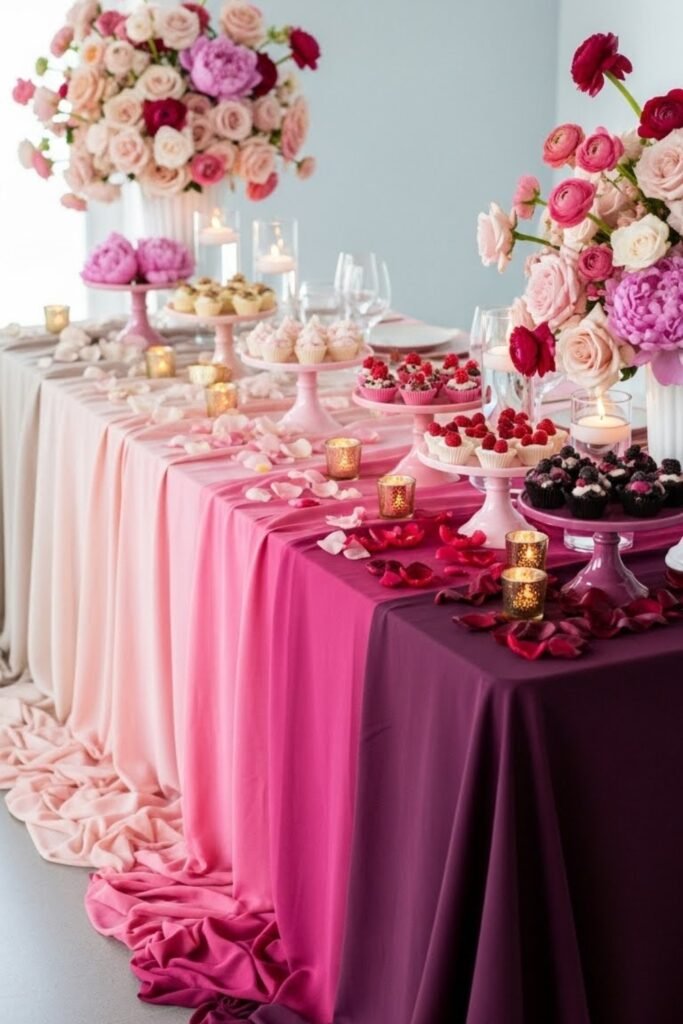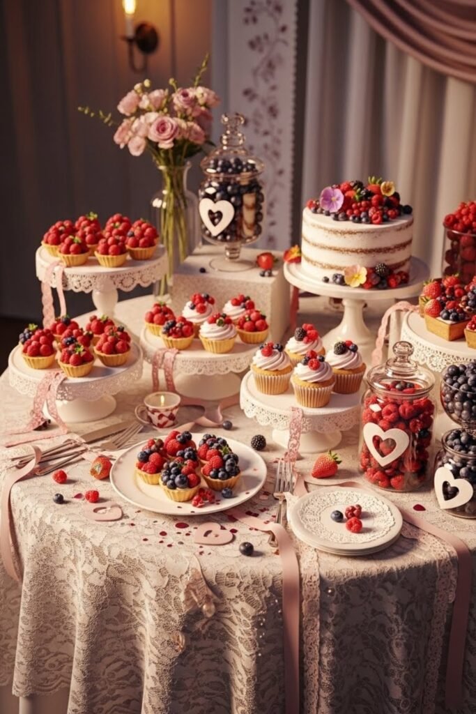 Focus on romance and softness using gentle berry hues, lace accents, and heart-inspired details. Keep décor light and elegant rather than overly themed.