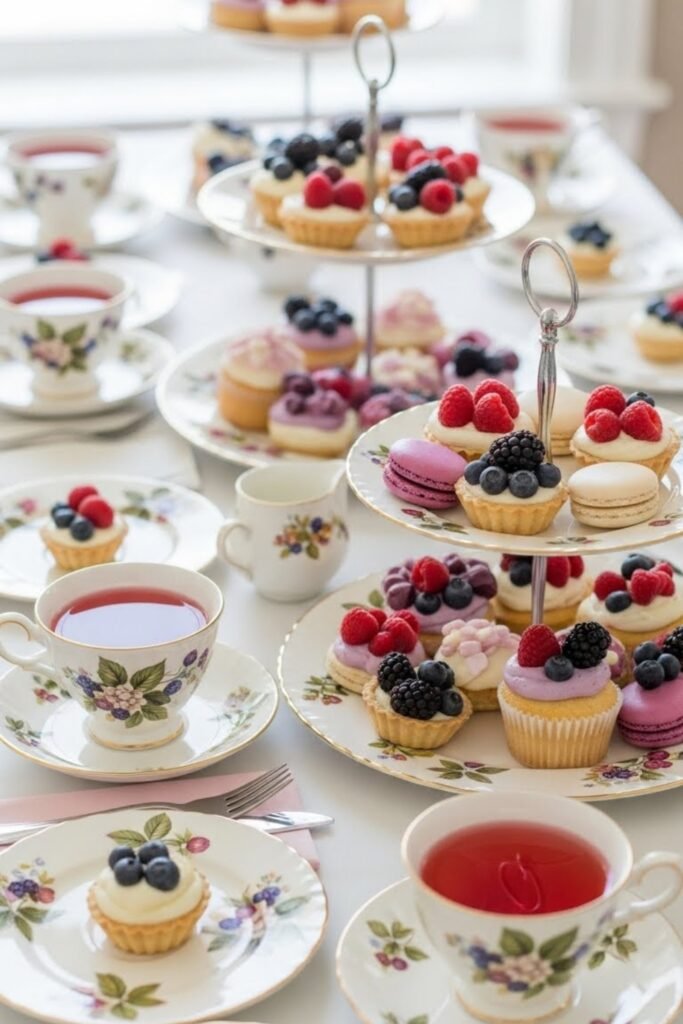 Style the shower like a relaxed afternoon tea with berry-inspired treats. Use teacups, tiered trays, and floral details paired with soft berry colors.
