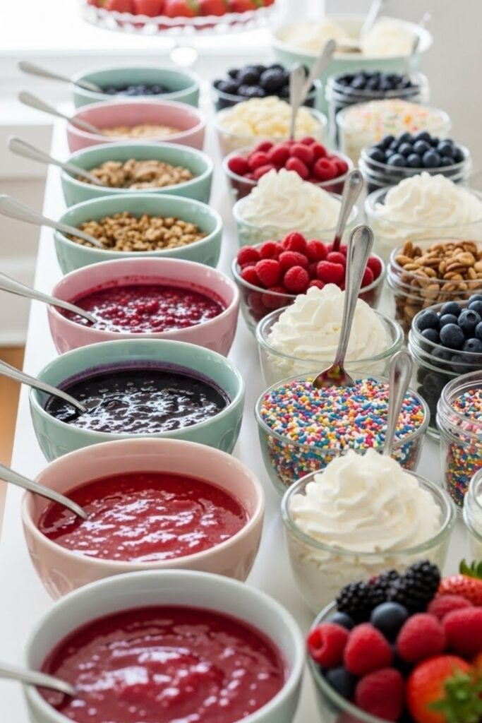 Create a fun dessert-focused theme inspired by berry sundaes. Set up a topping bar with berry sauces, sprinkles, and pastel bowls.