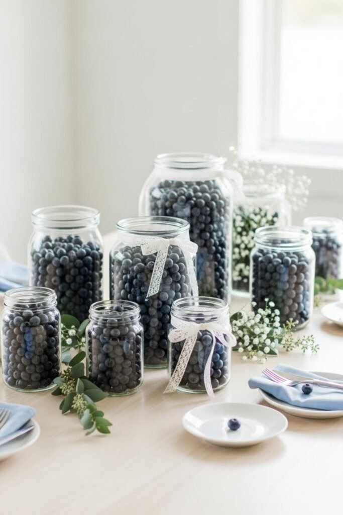 This idea focuses on calm, soft blue tones inspired by blueberries. Use pastel blues, whites, and clear glass jars filled with berry-themed treats.