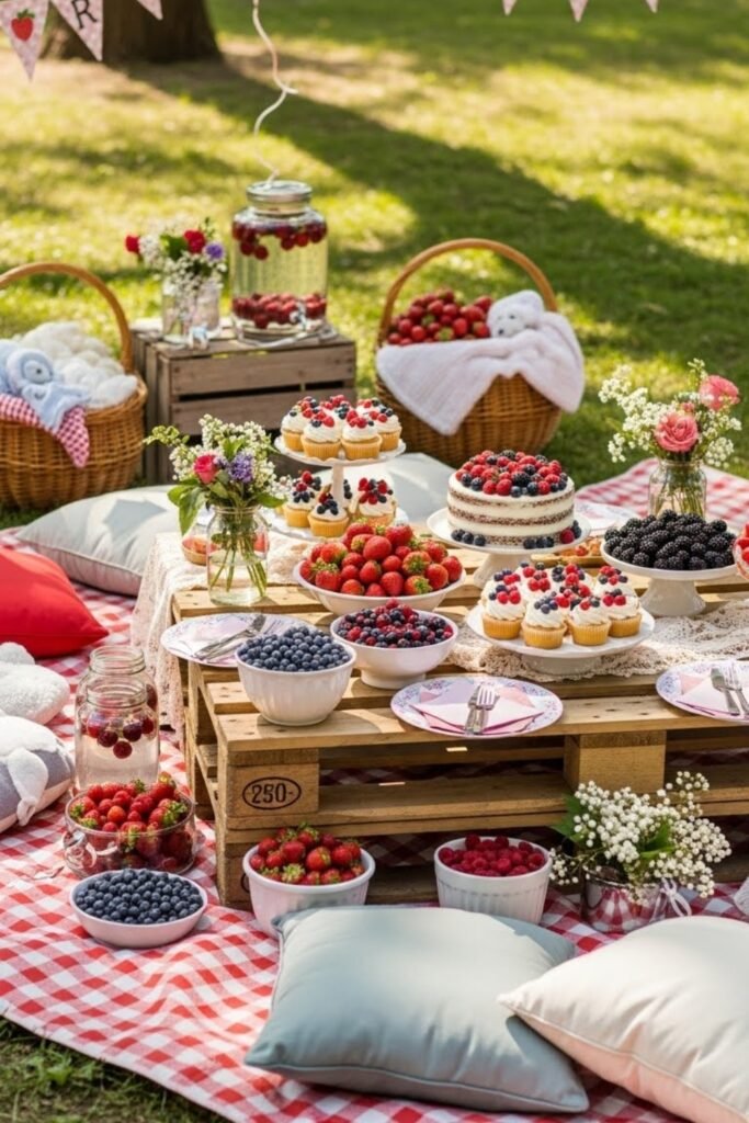 Bring picnic vibes indoors or outdoors with checkered tablecloths, picnic baskets, and berry-themed décor. Lay out low tables or blankets for a relaxed setup.