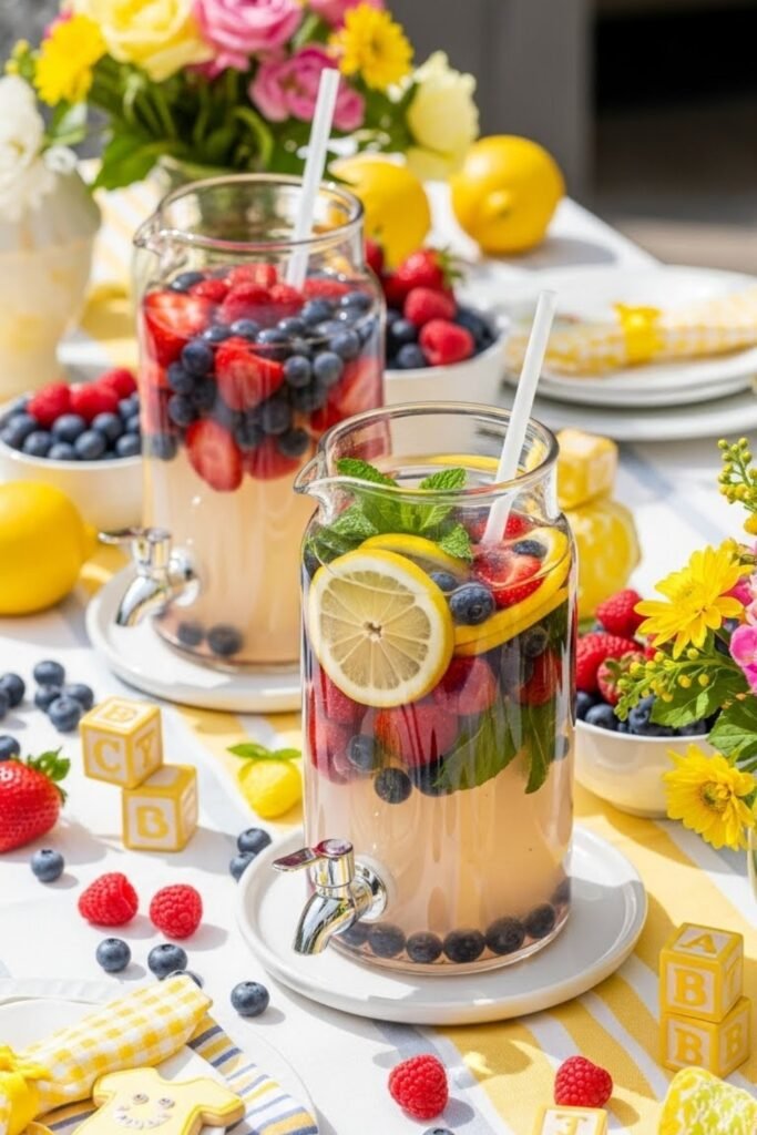 This theme works especially well for warm-weather baby showers and keeps guests naturally gathered around the drink station.