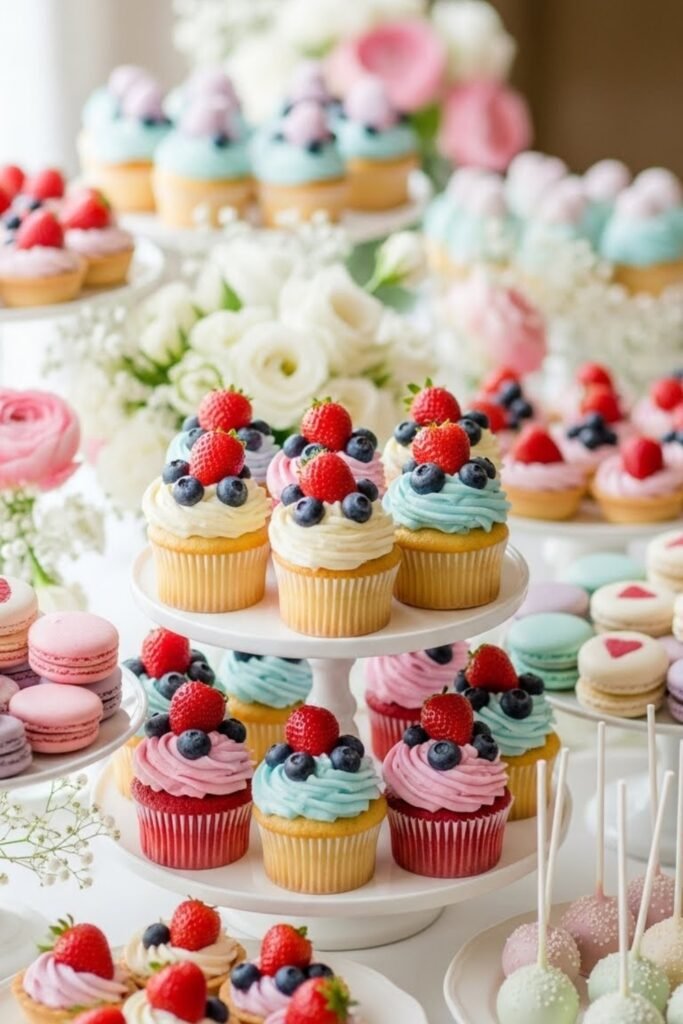 Make cupcakes the star of the shower with berry-topped desserts displayed on stands. Use coordinated wrappers, soft berry colors, and simple signage to avoid clutter.