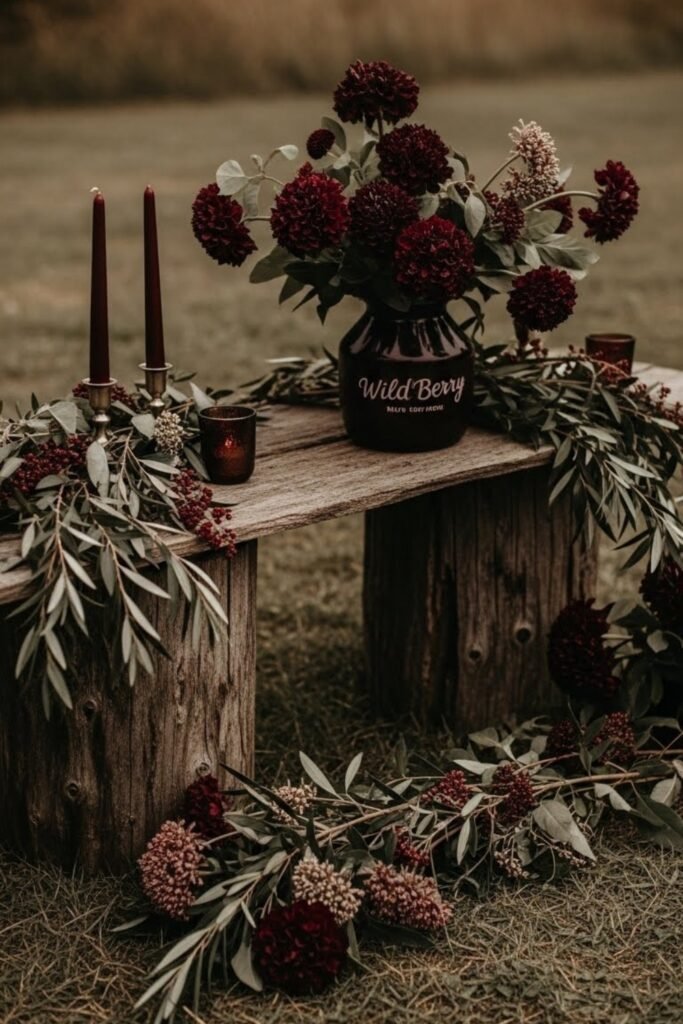 Create a slightly untamed berry look inspired by nature. Use darker berry shades, wood textures, and loose greenery rather than polished décor.