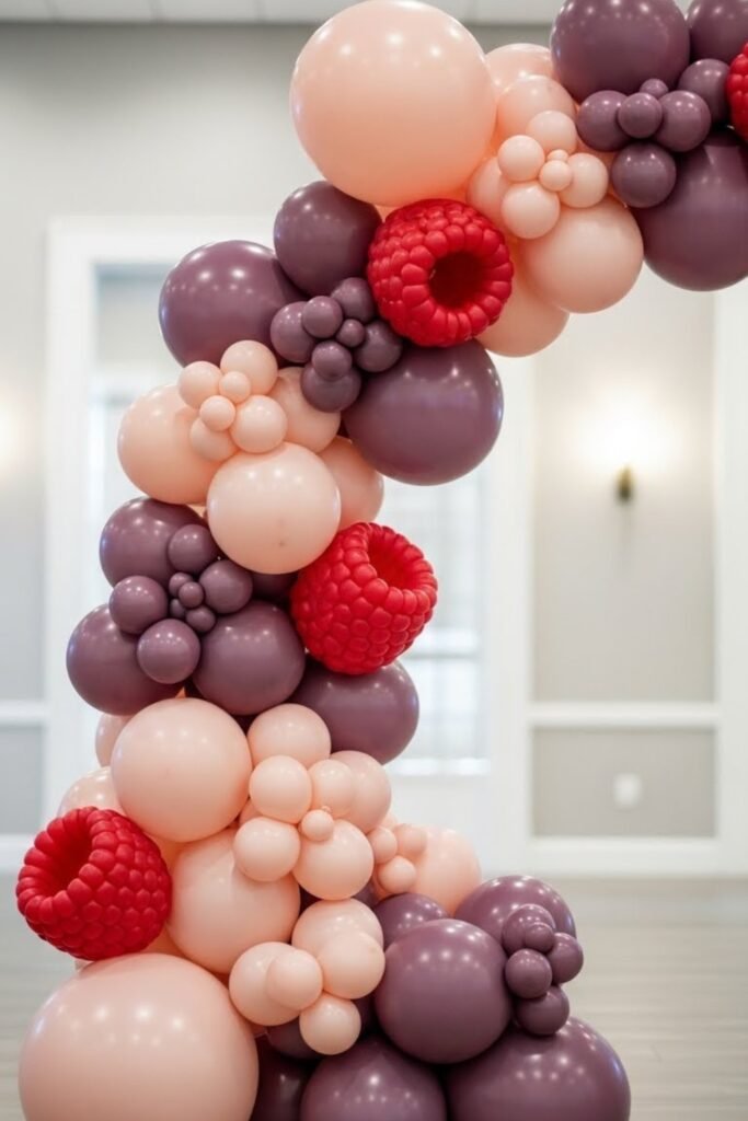 Focus on balloon styling using layered berry shades like blush, raspberry, and soft plum. Build arches, clusters, or table accents instead of filling the room.