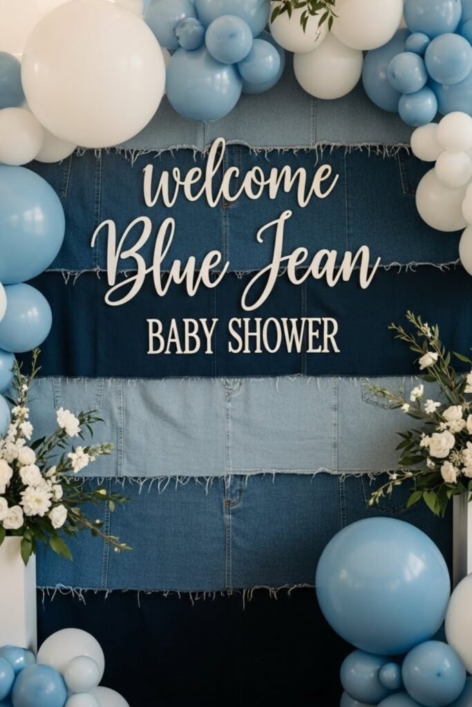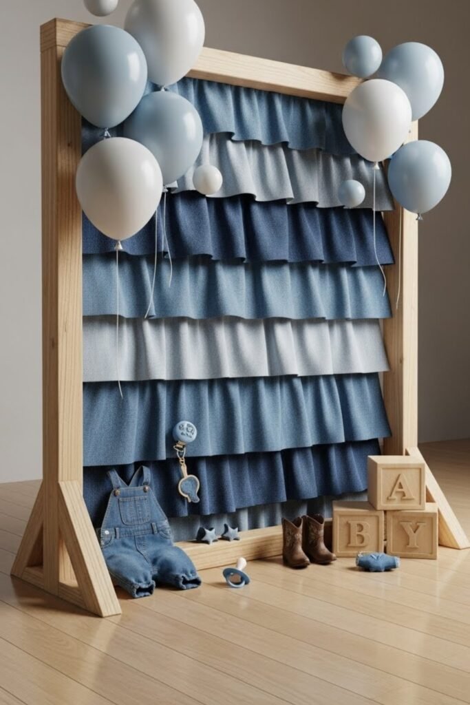 Set up a denim-themed photo booth using layered blue backdrops and simple props like baby hats or signs. Add stitched-style frames or wooden accents to keep it on theme.