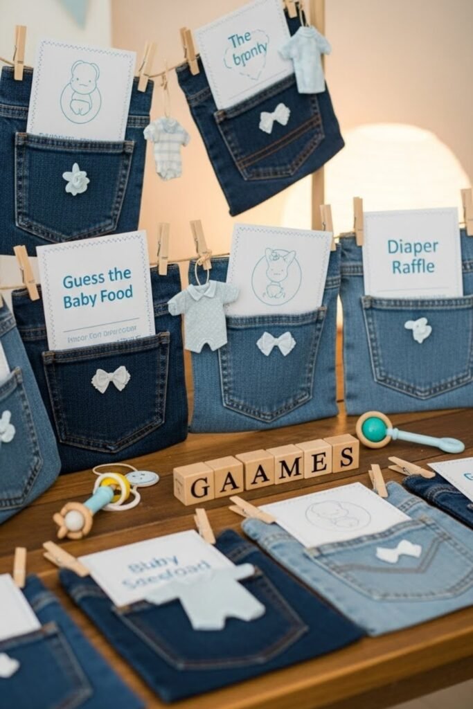 Design baby shower games that feature denim pockets as holders. Use them to display question cards or game instructions.