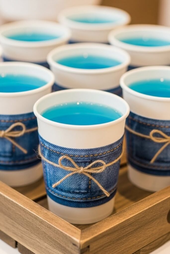 Wrap disposable cups with denim-style paper or fabric bands. Secure them with twine or small stitched labels for a finished look.
