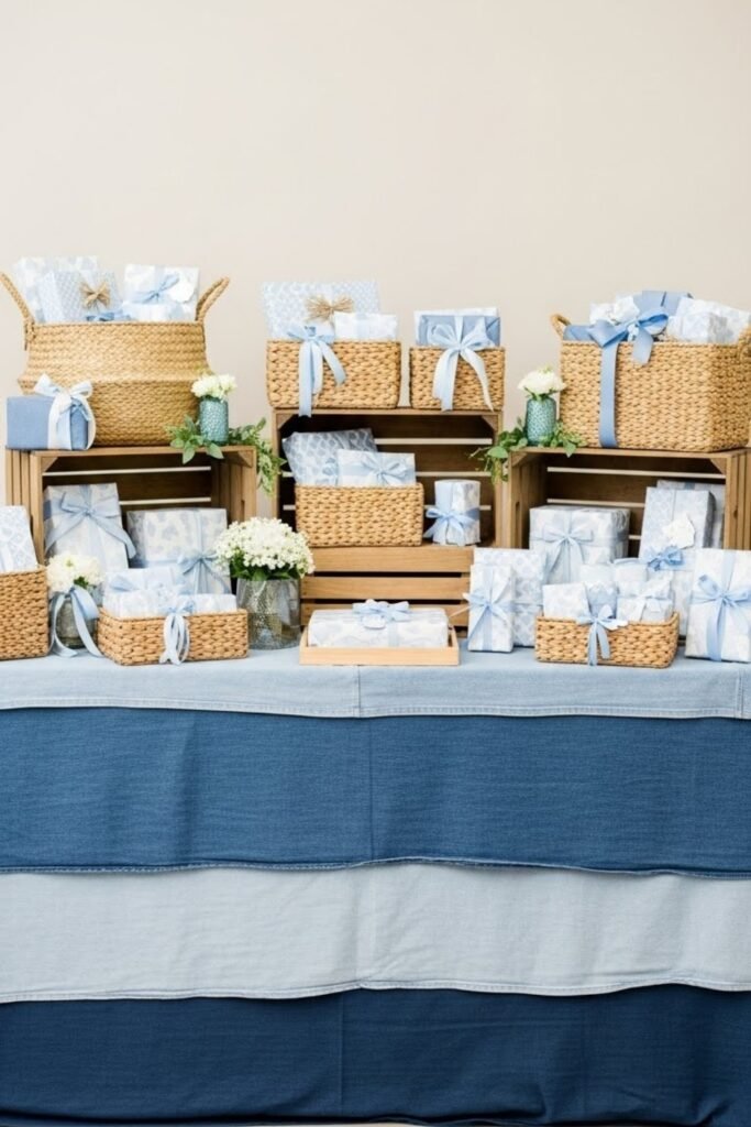 Style the gift table with layered denim fabric and simple wood accents. Use baskets or crates lined with blue fabric to hold presents neatly.