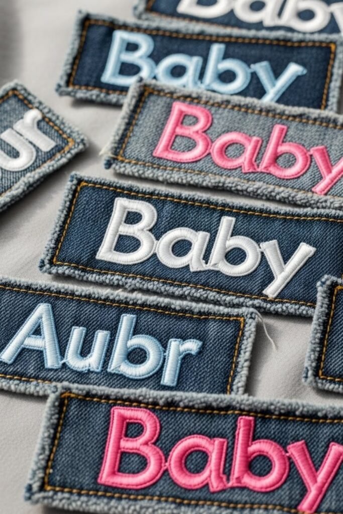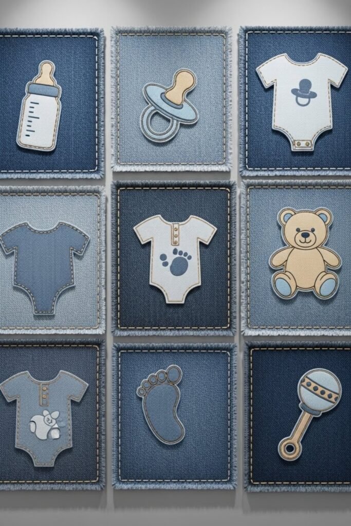 Create a garland using fabric patches inspired by denim labels, stars, hearts, or baby icons. String them across walls, shelves, or tables for soft decoration.