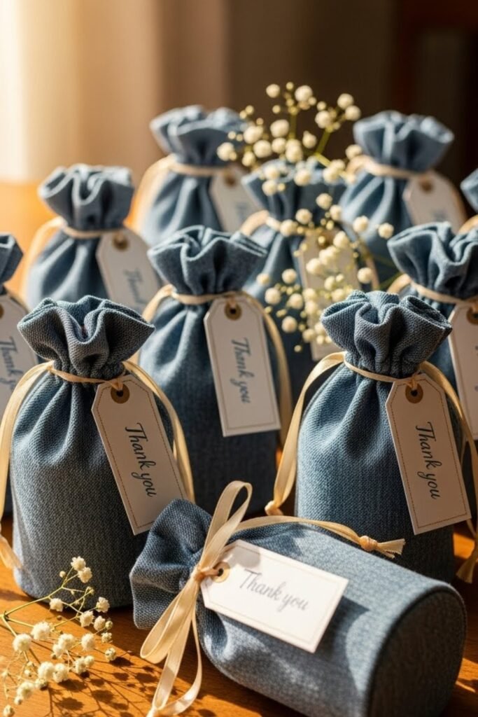 Use denim-style favor bags or fabric pouches for guest takeaways. Fill them with small treats or keepsakes and finish with a simple tag.