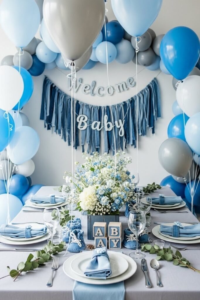 Build your color palette around washed denim shades like light blue, faded indigo, and soft gray. Use these tones across linens, balloons, and table accents for a calm, cohesive look.
