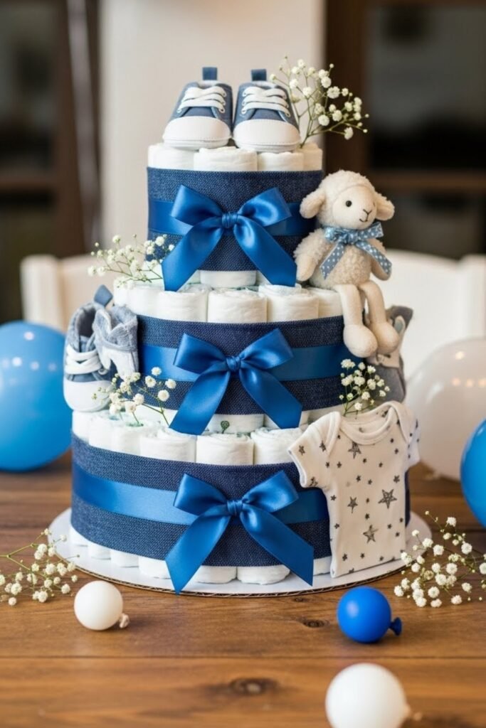 Create a diaper cake wrapped in denim fabric or blue ribbon to resemble folded jeans. Add small baby items like socks or pacifiers as toppers.