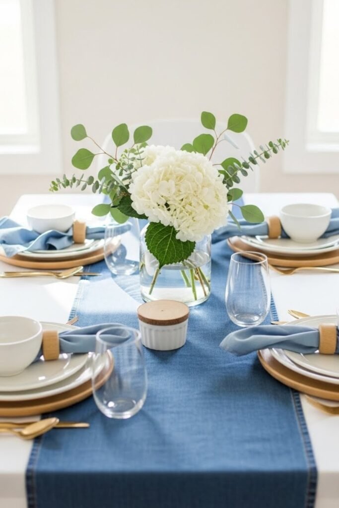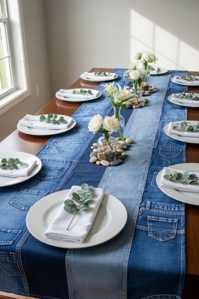 Style tables with denim-inspired runners or folded jean fabric placed down the center. Pair with white plates and light wood accents to keep the look clean.