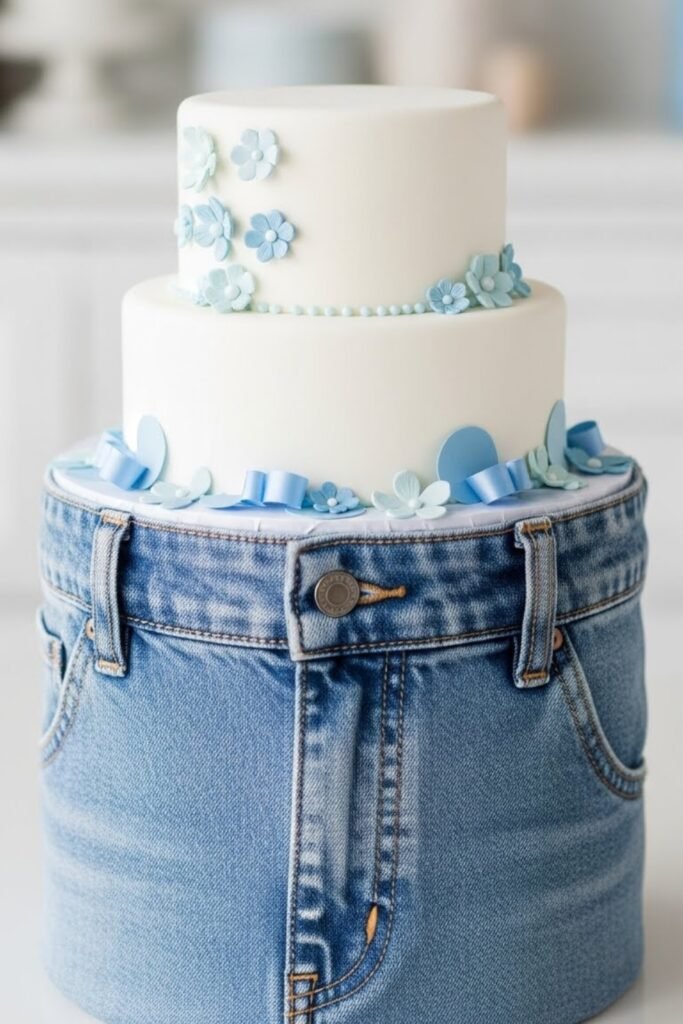 Wrap the base of the cake stand or cake board with denim-textured fabric or blue ribbon. Keep the cake itself simple so the wrap becomes the statement.