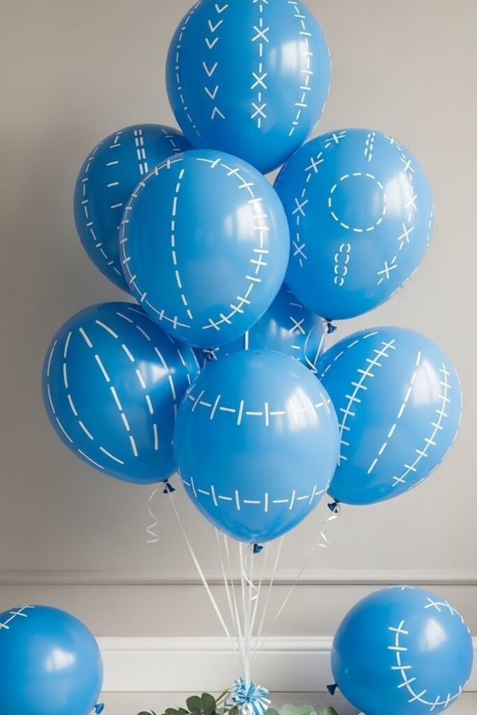 Decorate balloons with faux stitch lines using white paint pens or vinyl decals. Keep the balloon colors in soft denim shades for consistency.