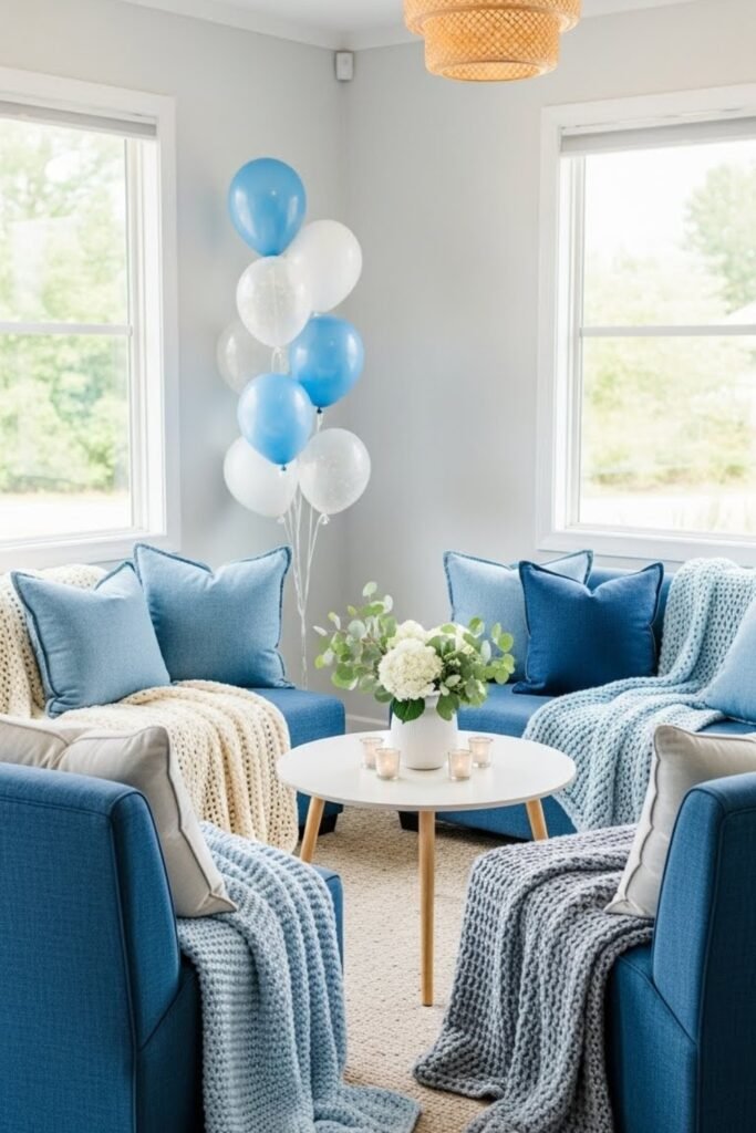 Create a small seating area with denim-toned cushions, throws, and simple chairs. This gives guests a comfortable place to relax and chat while staying on theme.