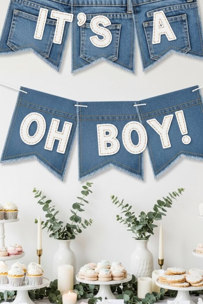 Hang a custom banner made from denim-textured fabric or faux jean panels. Add simple white lettering or stitched-style text to match the theme.