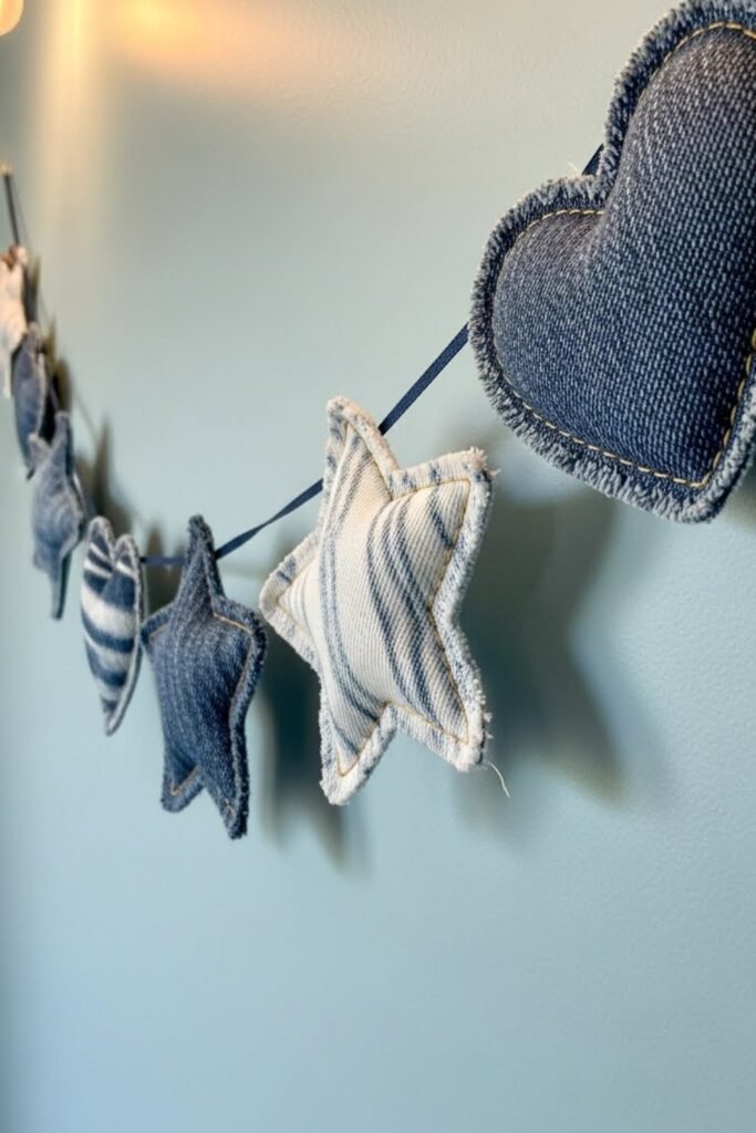Hang denim-inspired fabric pennants across walls or tables. Use different blue shades and soft patterns to create movement and visual interest.