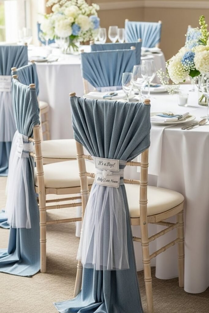 Wrap chairs with denim-inspired sashes or blue fabric bands. Add small stitched tags or baby-themed charms to keep the look subtle but intentional.