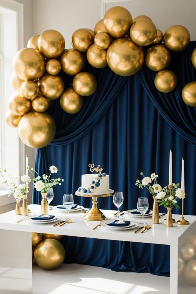 This idea focuses on a polished blue and gold color palette [Check on Amazon] for a stylish boy baby shower. Use navy or dusty blue backdrops, gold balloons, and metallic table accents.