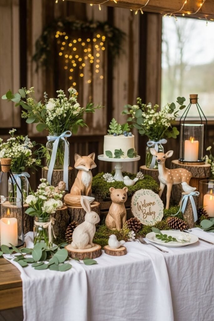 A woodland baby shower [Check on Amazon] uses soft blues mixed with natural elements like wood, greenery, and forest animals. Decorate with tree accents, rustic tableware, and cozy textures.