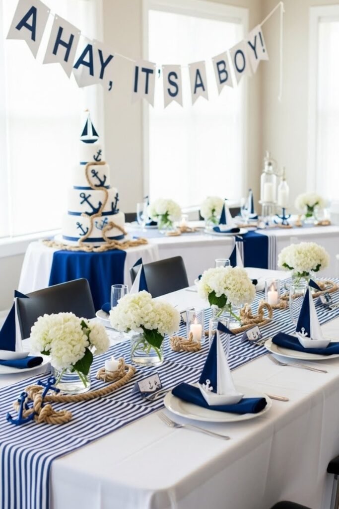 Create a nautical-themed baby shower using navy blue, white, and subtle rope or anchor details. Add sailor-inspired decor, striped table settings, and ocean-themed accents.