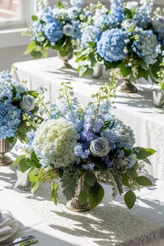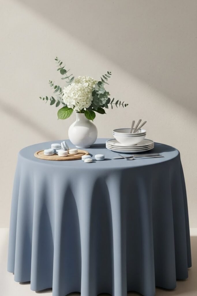 This idea blends muted blue shades with neutral colors like beige and white. Use simple decor, natural textures, and clean table setups for a modern look.