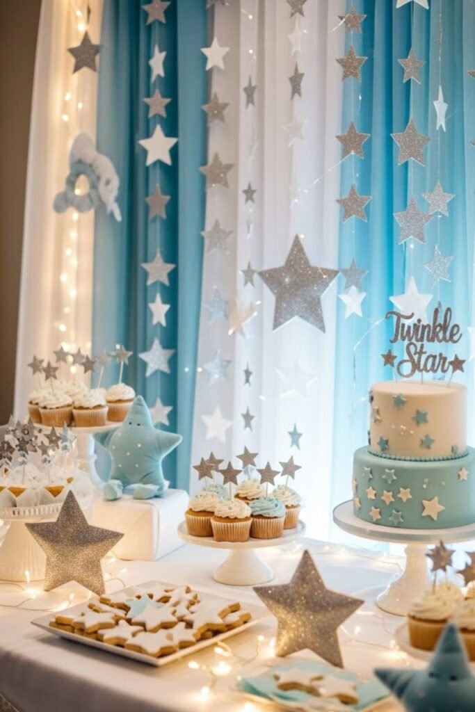 A twinkle star theme [Check on Amazon] features soft blue decor paired with subtle star accents and warm lighting. Use fairy lights, star-shaped details, and gentle color tones to create a cozy atmosphere.