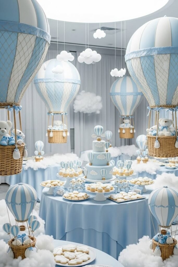 A hot air balloon theme [Check on Amazon] adds a whimsical touch using soft blues, whites, and balloon-shaped decor. Use basket-style props, floating balloon designs, and cloud accents.