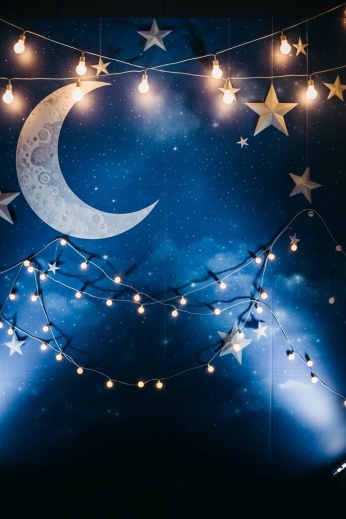 This theme uses deep blues, moons, and star details to create a calm nighttime vibe. Decorate with dark blue backdrops, soft lighting, and subtle celestial accents.
