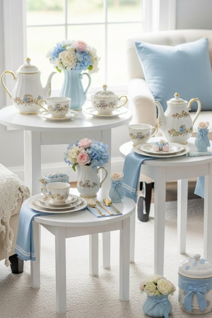 A baby boy tea party [Check on Amazon] features small tables, delicate tableware, and soft blue decor. Add simple florals and light snacks for a relaxed setup.