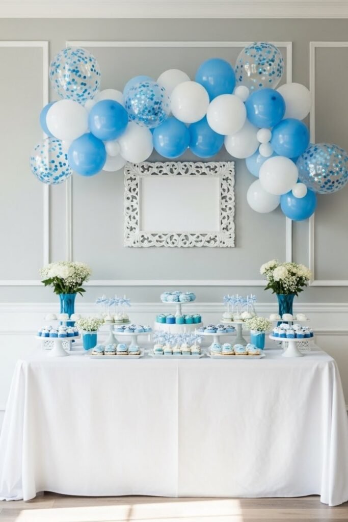 Classic blue decor never goes out of style. Use traditional baby blue tones with white accents for balloons [Check on Amazon], table settings, and signage.
